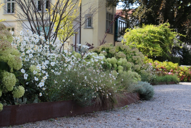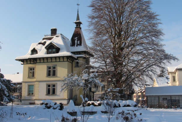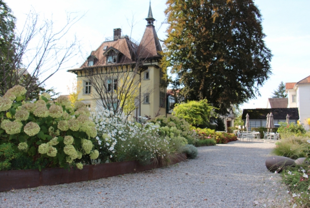 Angrenzend an das Grundstück der alten Fabrik, wo auch GINKGO beheimatet ist, steht eine alte Jugendstilvilla. Das Haus wurde 2012 total saniert, ebenso der Gartenpavillon. Der alte Buchsgarten wurde originalgetreu nachgebaut und die restliche Fläche erwachte im Sommer 2013 aus dem Dornröschenschlaf zu einem zeitgenössischen Garten mit grossen Blumenbeeten und Kiesflächen. Der Garten ist öffentlich und lädt zum Flanieren ein. Aber nicht nur.Der Garten kann auch gemietet werden, für private oder öffentliche Anlässe. Das Konzept wurde durch GINKGO so gestaltet, dass in der Mitte des Gartens für ca. 100 Personen eine Tafel gedeckt werden kann.